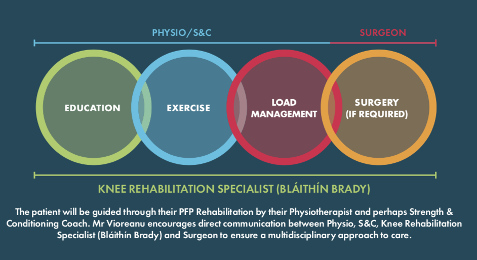 Many studies have found that Exercise-therapy is the key component to patellofemoral rehabilitation. A robust body of evidence (60 high & moderate quality published papers and systematic reviews including meta-analysis) reports significant pain reduction and improvement in function with Exercise-therapy compared to control, placebo interventions in the short and medium time to follow up. The existing evidence also highlights the importance of long term management for these patients.